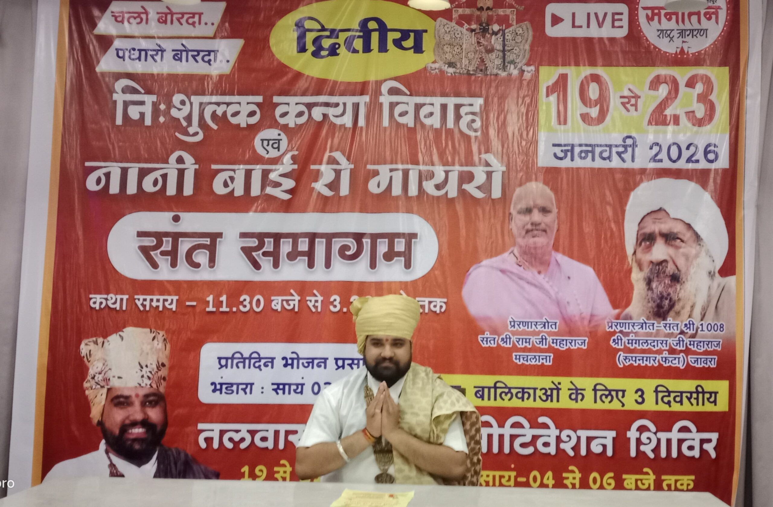 जावरा। सनातन राष्ट्र जागरण मंच के बैनर तले ग्राम बोरदा में द्वितीय निःशुल्क सामूहिक कन्या विवाह एवं नानीबाई को मायरो कथा का भव्य आयोजन 19 जनवरी से 23 जनवरी 2026 तक किया जाएगा। यह आयोजन क्रांतिकारी संत पंडित श्री मनोज कश्यप शेरपुर के सानिध्य में होगा।